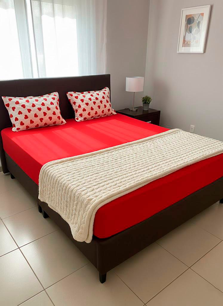 Lençol tamanho Casal padrão. Contém: 1 – Lençol com elástico 1,38m x 1,88m. 2 – Fronhas com enchimento 50cm x 70cm. Composição 100% algodão. Enchimento: 100% Fibra acrílica.